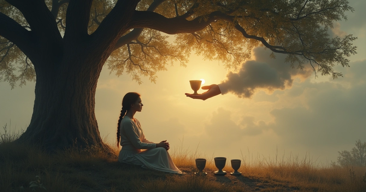 To understand what the Four of Cups truly means, we can start with the classic imagery. A figure sits cross-legged beneath a tree, arms folded, eyes fixed—inward and downward. Three cups rest before them, and a mysterious fourth cup floats mid-air, offered by an unseen hand. Many decks follow this visual language, though modern interpretations add fresh details.