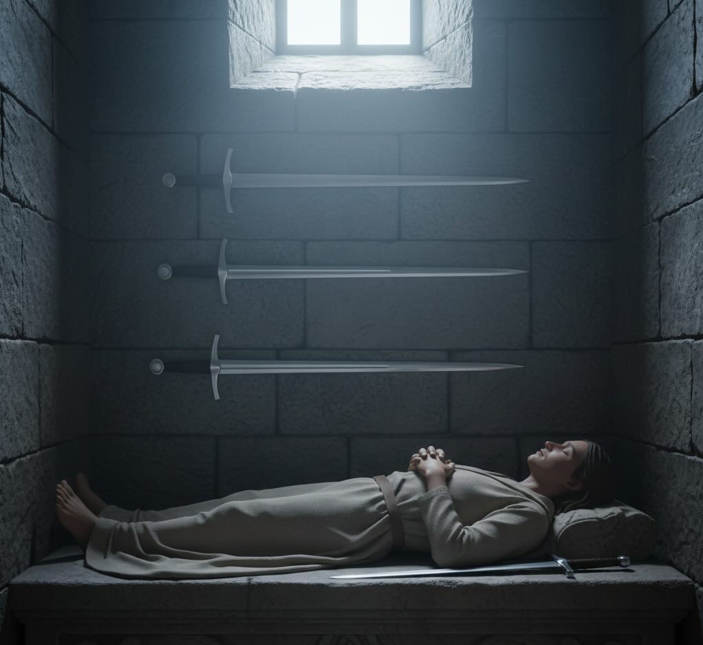 The image on the Four of Swords often depicts a figure lying in peaceful repose, hands folded, sometimes beside or before three swords mounted and one beneath. There is silence, safety, and a sense that, for now, the world must wait.