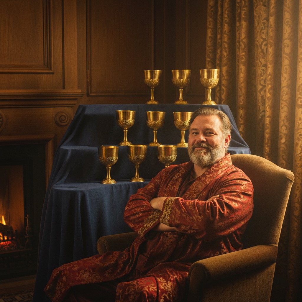 Before we explain nuances, let’s stop to look closely at the traditional Rider-Waite-Smith depiction: a contented figure sits comfortably on a wooden bench. He’s dressed in blue and red, sometimes with arms crossed in pride. Behind him is a raised, curved table lined with nine gleaming golden cups, forming an arch. Nothing distracts the eye. The individual’s slight smile hints at a subtle confidence. This is not a party in progress, but a moment of quiet, satisfied rest after efforts rewarded.